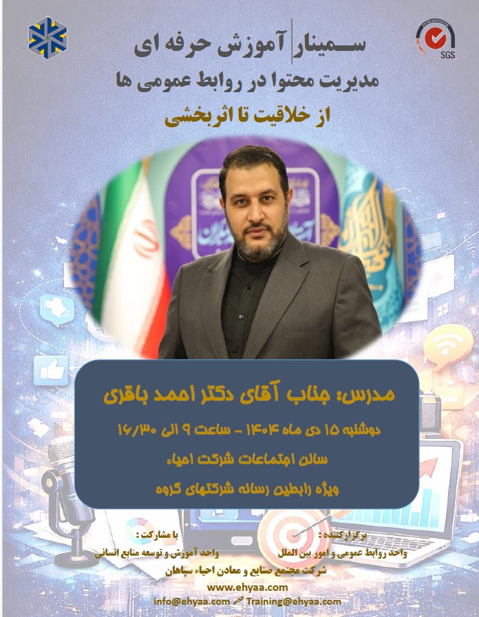 دوره آموزشی «آموزش حرفه‌ای؛ مدیریت محتوا در روابط عمومی‌ها؛ از خلاقیت تا اثربخشی» روز 15 دی‌ماه 1404 به میزبانی شرکت مجتمع صنایع و معادن احیاء سپاهان برگزار شد. این دوره آموزشی به مدت 8 ساعت و با تدریس دکتر احمد باقری، صاحب امتیاز خبرگزاری گزارش خبر، موسس و مدیر سایت «دانشگاه سئوی ایران»، با حضور جمعی از کارشناسان و فعالان حوزه روابط عمومی گروه احیاء سپاهان و شرکت های زیر مجموعه برگزار گردید.