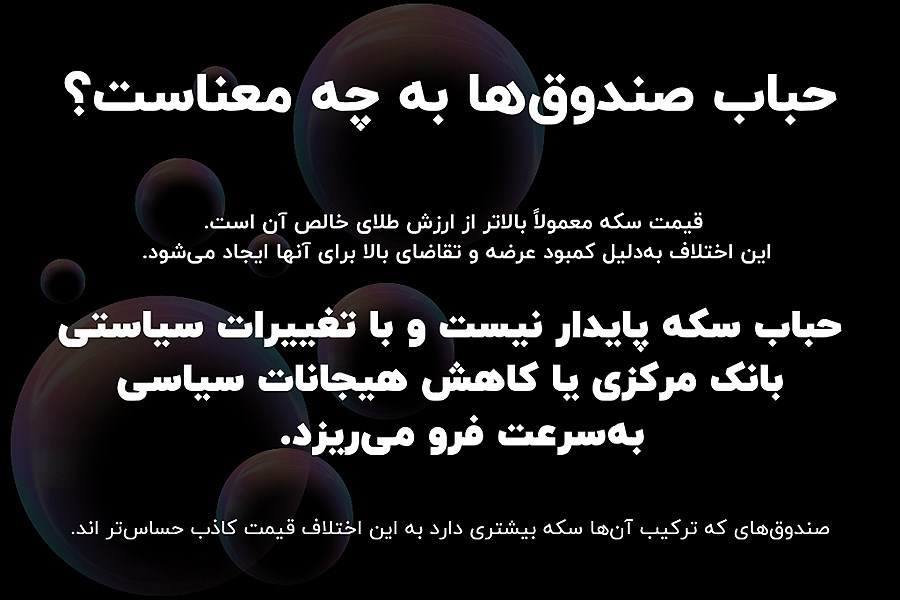علاوه بر حباب سکه و شمش، سرمایهگذاران باید مراقب حباب قیمت واحدهای صندوق نیز باشند. هر صندوق دارای یک «خالص ارزش دارایی» (ارزش واقعی کل طلاهای موجود در صندوق) و یک «قیمت بازاری» (قیمتی که روی تابلوی بورس معامله میشود) است.